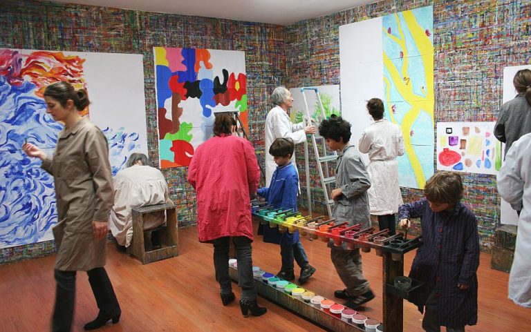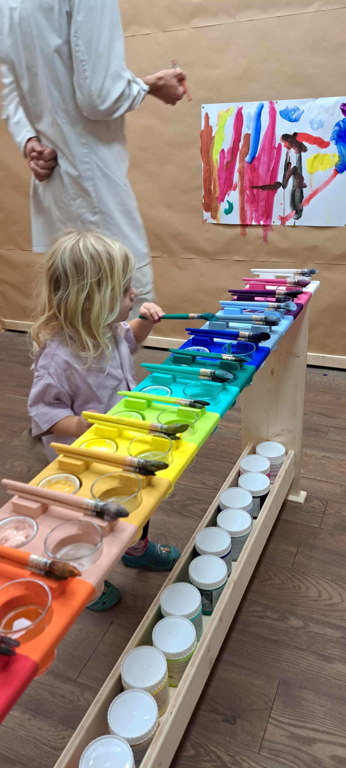 Im Zentrum steht der Farbentisch mit 18 hochwertigen Gouachefarben und feinen Pinseln. Du malst auf große weiße Blätter, die an die Wände geheftet sind. Dabei bewegst du dich zwischen Wand und Tisch – dein ganzer Körper wird Teil des Malprozesses.